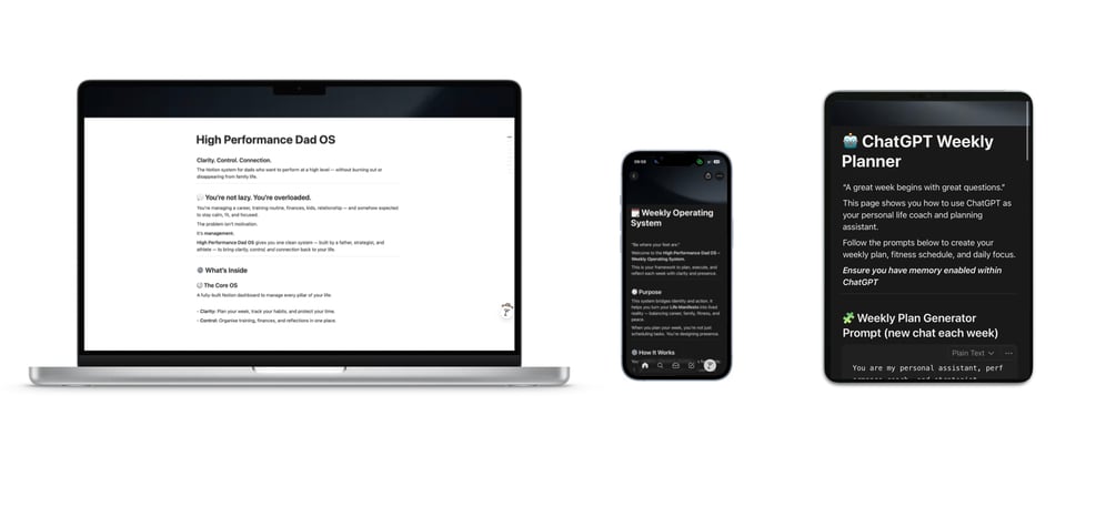 A complete Notion-based life operating system designed specifically for dads who want to: